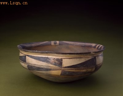 新石器时代仰韶文化半坡类型,高16.4cm,口径37.4cm。 盆折沿,深直腹,圜底。泥质红陶。口沿及外腹部均以黑彩描绘纹饰,口沿上描绘以点定位的水波纹,腹部描绘两层三角形几何纹,两层三角形纹饰的大小及形状相同,但方向相反。可能是由鱼纹逐渐抽象演变而来。此彩陶盆的造型和纹饰具有新石器时代仰韶文化半坡类型(约公元前4800~前3900年)彩陶的典型特征。 鱼纹是仰韶文化半坡类型彩陶中的常见纹饰,著名的西安半坡人面鱼纹彩陶盆描绘的就是一个人脸口衔鱼的形象,可见鱼和半坡人们生活的联系。