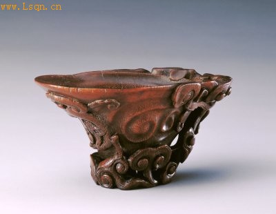 此杯装饰简练,但布置得宜,繁简得当。其刀法粗犷,在不同部位运用不同的装饰手段,特别是足部处理尤为精妙。杯体色泽沉暗,古朴雅致。