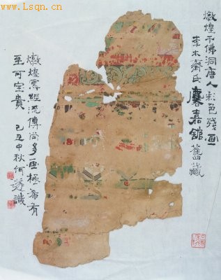 纸本,设色,纵28cm,横16.5cm。 图案为横向二方连续,上第三列为卷云纹,以下多为几何图案。以淡墨勾勒,填彩以红绿为主,间有白、绛、赭诸色。因年代久远,色彩显得斑驳不全。 题跋:“敦煌千佛洞唐人彩色残画,李木斋氏麐嘉馆旧藏。敦煌写经流传尚多,画极希(稀)有,至可宝贵。己丑中秋何遂识。”下钤朱文“何遂”、白文“叙圃书画”、朱文“丁亥年六十”印三方。 此画残片于1955年由何遂先生捐献故宫博物院。据何遂录题跋示曾为李盛铎麐嘉馆收藏。