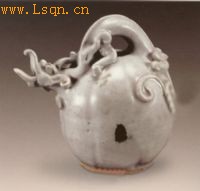 通高12厘米。 注身为瓜瓣形,釉色卵白,饰一黑色斑点,欲称“铁绣花”。全器造型独特,运用濯条塑造翘首挺角的龙头作流口,龙颈贴于壶身,蜷曲肥壮的龙身为提梁,龙的肢尾鼓凸并蟠于壶的上部,呈飞腾之状,为元代青白釉瓷器中实用艺术的典范。