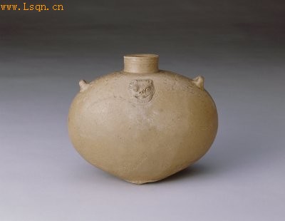 口径4.2cm,最大腹径18cm,高14cm。 壶小直口,肩上有两小系,器身呈扁椭圆形,平底微内凹。通体施青釉,双系之间印圆圈带状装饰,中间贴塑一兽头,这是西晋时期普遍采用的一种装饰方法。扁圆的形体和设计巧妙的双系使之既实用又便于携带。