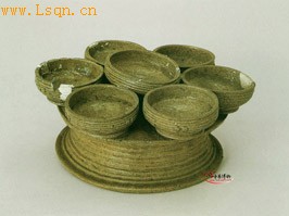 通高10.4厘米、口径7.2—7.8厘米、底径18.1厘米。 原始瓷器。上为七个敞口、鼓腹、平底相联的杯,共同放置在平顶、喇叭形口的器座上。各杯与器座表面,都饰有密集的弦纹。造型别致,具有较高的工艺价值。