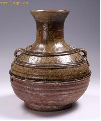 撇口,直颈,斜肩,肩部塑两竖系,球形腹,饰弦纹。部分施青釉,露胎处呈红褐色。