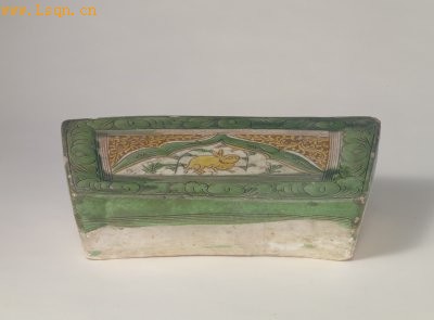 高10.5cm,面横36.8cm,面纵17cm,底横36cm,底纵14.5cm。 枕略呈扇形,枕面边缘刻划花叶纹,中心为复线长方框,内有一花瓣形开光,开光内刻划黄兔、绿草、白色的土地。开光外为黄色剔花卷枝纹。施釉至枕侧一半处,釉边沿饰复线装饰。枕背面有一圆形通气孔。素底。 此枕主题纹饰更加突出,设色淡雅清新。 从现存实物资料看,宋代大多数三彩枕以绿色为基调,辅以黄、白、褐等色,几乎不见蓝色,配色清新明快,柔和淡雅。纹饰主要有人物、花鸟、动物等。