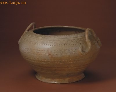 高16cm,口径17cm,足径15.6cm。 罐口内敛,两面各置一绳状耳,圆肩,硕腹,近底内收,实足外撇,平底。通体施青釉。以模印横竖网纹装饰。 网纹又称网格纹、方格纹,是陶瓷装饰的原始纹样之一。网纹起源于新石器时代仰韶文化彩陶器,是史前新石器时代渔猎生活在原始制陶及审美意识上的反映。东汉至六朝前期的青瓷上,网纹盛行。东晋以后网纹不再流行。明清瓷器上作为边饰,网纹偶有出现。