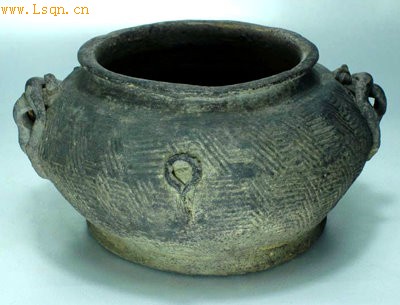 敛口,平沿,短颈微束,扁圆腹,实足。肩腹部两侧塑有两兽形双耳,另两侧又塑有两简单环状堆塑纹,器表拍印曲折纹。器型古拙,质朴稳重。