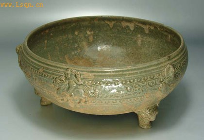 洗为钵形,敛口、圆唇、弧腹、玉环底,底微内凹,底部附三兽足。器外壁饰弦纹和联珠纹,间以如意纹的带条装饰,四周堆塑有佛头及骑马和麒麟的人物;内壁饰弦纹和水波纹。内外施青釉,釉水青绿,底部不施釉。器型规则,纹饰清晰,装饰考究,工艺精致,当为越窑器中的精品。
