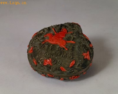 此盒桃形,通髹绿漆雕饰汹涌海水,红色花瓣随浪翻滚。盒盖面朱漆雕张果老执鞭骑驴,踏波前奔。其做法是先髹绿漆以刻波涛,后按设计全部剔除人畜及花瓣轮廓内的绿漆,再填入红漆并雕仙人骑驴及花瓣图饰,因而红绿分明,具浮雕效果。人物牲畜的细部均在填色之后用刀剔刻,流畅自如,毛驴鬃毛竖直,细若游丝,四蹄腾空,给人以奔腾的动感,精妙绝伦。