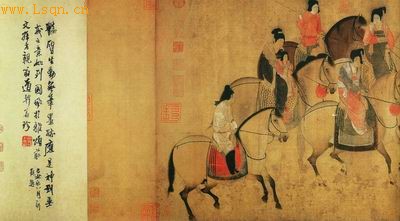 唐代名家张萱所作《虢国夫人游春图》,内容绘杨贵妃的姊妹虢国夫人骑马游春,为家人随意郊游状。画中虢国夫人身着春装,粉红绸衫,绿色裙裾,露出粉胸粉脖,头上扎着流行的马尾髫,时髦、高贵而凉爽。随伺有手持马鞭的马夫、侍女多人。主人的马,项下系有红球。这本身就是皇亲的娱乐。同时代的《春郊游骑图》,也有数名侍者随骑。“后四骑,一夹弹,一囊笛,一韬琴,一负酒”。其画中主人的身份,非皇亲及国戚无疑。