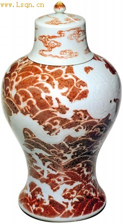 清雍正红底白龙海水纹盖罐
