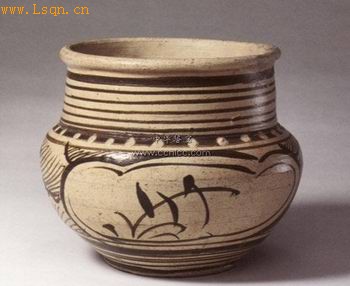 罐广口,圆唇,直颈,扁腹,圈足。颈及足部褐彩绘多道弦纹,肩颈之间一周黑地白点纹。腹部开光内绘折枝花草纹,开光外绘变形海水纹。纹饰简练草率。这种装饰技法源于北方磁州窑,但又具有地方特色。磁州窑白地黑花品种白黑对比强烈,而吉州窑白地实为土黄色,黑花实为褐色。纹饰布局多以开光形式出现,常见奔鹿纹、花草纹。南昌南宋嘉定二年(1209)墓出土的莲花纹炉及奔鹿纹盖罐为这类器物的断代提供了有价值的依据。除罐以外,白地黑花器物还有瓶、壶、炉、尊等。