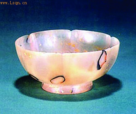 玛瑙易损,故传世的玛瑙制品极为珍贵。玛瑙碗,尤其工艺精美的玛瑙碗是不多见的。笔者在河北省博物馆见到的这件玛瑙花式碗为宋代产物,已存世千年了。它质地致密,晶莹剔透,深腹,圈足,形若盛开的海棠花,典雅秀丽,别致脱俗。六瓣柔和妩媚的“花瓣”上,可见紫红色斑纹,虚实相生,相得益彰,充分展现了玛瑙色彩斑斓、晶莹剔透的特性,整器琢雕自然流畅。