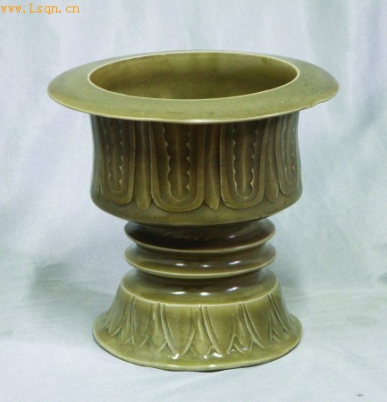 宋耀州窑豆型炉比较少见,如此造型大气,实为罕见之物,诸多同好见之都喜出望外,堪称一绝。此为仿新石器时代的陶豆器。炉高15.5厘米,直径17厘米,炉沿为厚唇,唇宽2.6厘米,胎土细腻,施釉滋润、均匀,无积釉的现象,亭亭玉立,美观大方。炉上身为10片芭蕉叶刻花,宽度为3.2厘米,微微有点束腰,显得流畅自然,立体感很强。芭蕉叶长得非常宽大挺拔,作为一种绿色植物来装点居舍,颇受文人雅士的喜爱。炉腰部收紧,分为二层,错落有致,下部呈喇叭状,12片莲花刻花纹饰,另有莲花叠瓣组合,显得沉稳协调,富有美感。这些刻花纹饰,打破了青釉单色瓷沉闷的感觉,将炉点缀得颇有生气和灵动。炉底心为露胎,可见当时烧制工艺的痕迹。