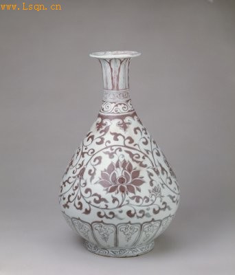 高32.5cm,口径8.5cm,足径11.5cm。 瓶撇口,细颈,垂腹,圈足。内外釉里红装饰。内口沿绘卷草纹,外壁颈部自上而下依次绘蕉叶纹、回纹、卷草纹,肩部绘下垂如意云头纹,腹部绘缠枝莲纹,近足处绘莲瓣纹。圈足外墙绘卷草纹。圈足内施白釉。无款识。 此瓶造型优美,纹饰层次分明,绘画工整细腻,釉里红发色略显灰暗,表明当时釉里红的烧制技术并未达到娴熟。 明洪武时期的玉壶春瓶纹饰题材丰富,构图严谨,主题纹饰鲜明醒目。
