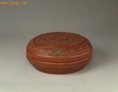 圆盒自下而上依次髹黄、绿、红三层漆之后,再雕饰花纹。其中的云龙纹、圆光以及最下方的海水江崖纹雕红漆,稍上的水锦雕绿漆,菱形地锦雕黄漆。盖面中心有一圆光,圆光内分刻水纹和火纹,双龙围绕圆光左右对峙,一龙首在上,另一龙首在下,呈戏珠之势。盒壁上下各有四个开光,开光内分别装饰菊花和牡丹花。开光之间有灵芝纹相间隔。盒内和外底均髹黑漆,外底上方有刀刻填金“大明万历乙未年制”楷书款。乙未是万历二十三年(1595年)。此盒刀法快利,构图紧凑,层次分明,错落有致,黄、红、绿三色交织,庄严中不失华丽。