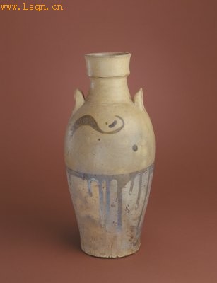 瓶盘口,细颈,溜肩,腹部修长,肩部两侧饰双系。外壁施半截黄釉,下半部露胎,釉面以绿彩装饰,花纹简朴大方。
