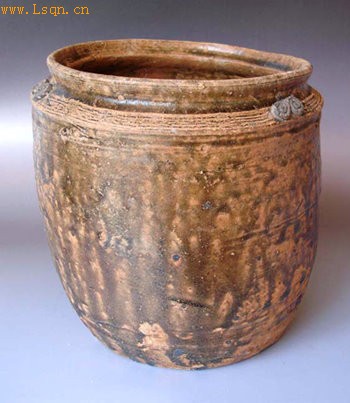 原始瓷器。敛口,束颈,折肩,筒形深腹,平底。肩部饰弦纹一组,肩部两侧各塑一S形附加堆纹,纹饰华丽古典。