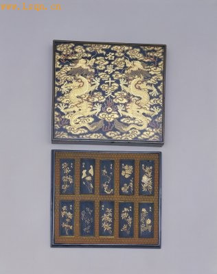 墨十锭一组,嵌装黑漆描金盒中。盒面中央隶书“名花十友”,饰云龙纹。