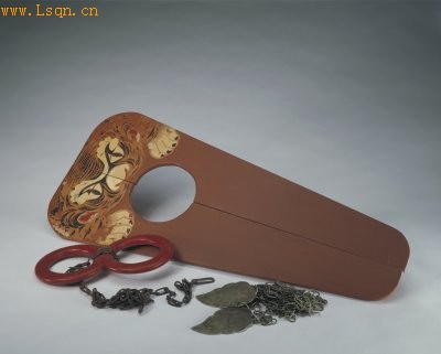 通长73.2cm。 枷是一种刑具,用以束缚犯人的颈部而使其无法挣脱。此枷为清代宫廷戏剧演出中的道具,适用于犯罪之贵族或武将。如《夜奔》中之林冲,发配途中即戴此类枷。若女性犯人则戴鱼形枷,如《女起解》中之苏三。 枷以木制,上阔下窄,左右单片通过两个宽约一寸的木楔子相合为一。枷身通体髹红漆,上端的正面与背面都彩绘虎头纹样。整体色彩沉重,以显示律法之威严。图中与木枷一起摆放的还有手铐与颈锁链。