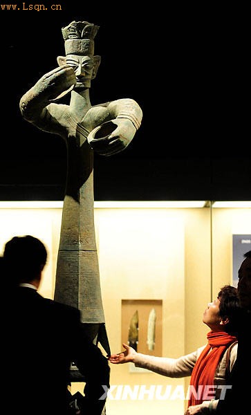 2月9日,参观者正在欣赏铜立人像。当日,一场名为“梦幻古蜀”的三星堆、金沙遗址出土文物展在山西省博物院开展,110多件珍贵展品亮相太原,展现出古蜀国的独特文化和精湛工艺。新华社记者 范敏达 摄