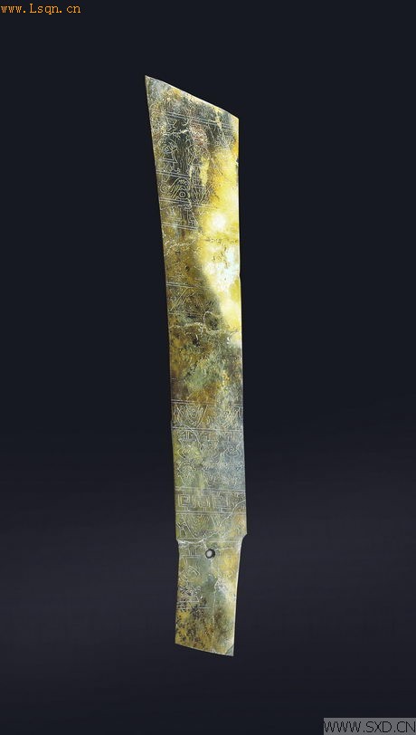 三星堆一号祭祀坑出土,通长38.2厘米。器身呈鱼形,两面各线刻有一牙璋图案,在射端张开的“鱼嘴”中,镂刻有一只小鸟。鱼鸟合体的主题,寓意深刻,可能与古史传说中古蜀王鱼凫有关。该器制作精美,综合运用了镂刻、线刻、管钻、打磨抛光等多种工艺,在选材上,还充分利用玉料的颜色渐变,随形就势以表现鱼的背部与腹部,可谓匠心独具、巧夺天工。( 三星堆博物馆)