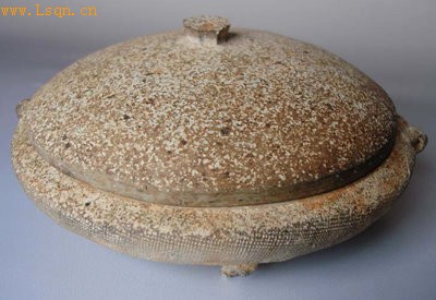 原始瓷器。敛口,扁圆形,浅腹,底附三足,两侧附两耳,伞形盖,盖面中心有一钮。外壁印布纹,胎薄质坚。造型规矩,线条流畅优美。
