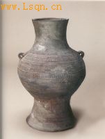 通高29.7厘米、口径10.2厘米。 此壶侈口,长颈,圈足较高,腹部饰弦纹四组,其间加饰篦点纹。整个造型简单朴素,给人以稳重感。从它的形象看,亦是由“陶匏”演变而来,今之“壶”字,在金文中就是它的象形文字,同墓中伴出的有陶鼎、陶瓿、陶豆和琉璃璧等,由此证明:它亦是“礼器”之一。