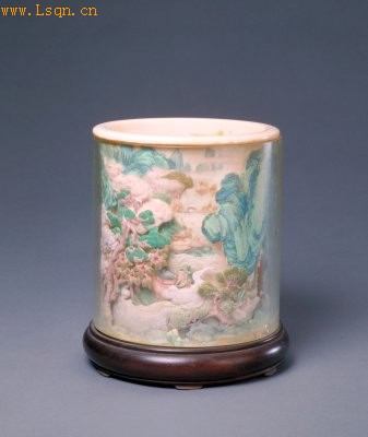 清 牙雕染色山水笔筒