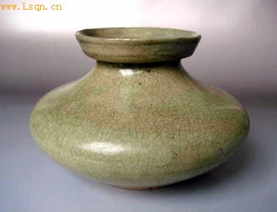 盘口,束颈,扁圆腹,平底微内凹。施青釉,釉水青绿,釉面光亮润泽,有开片,底部不施釉。