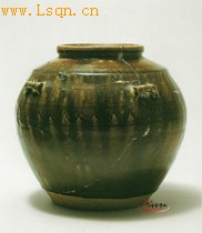 高20厘米、口径11厘米、底径12.1厘米。 侈口,弧腹,平底。肩部有四个横耳,并刻划一周水波纹,施以褐釉。此罐造型朴实、稳重。 东汉时瓷器已发明,并开始广泛流行,但其产品基本为青瓷,像这种烧制质量较好,又施褐釉的制品较为难得。
