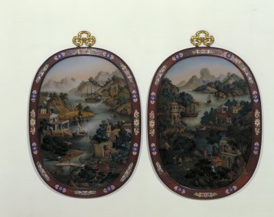 高93.5cm,宽70cm。 挂屏为椭圆形,边框用花梨木制作,上嵌欧式卷草花纹及盘长绵结纹的画珐琅片。屏心为玻璃油画,描绘了当时外贸港口的景象。画面上山水、树石还能看出些许中国传统的绘画风格,其他如人物、楼船等景物以及绘画的用料、色彩等则皆为欧式。这种玻璃油画需在玻璃背面反方向作画,具有一定的难度,它于明末清初由欧洲传入广州并形成规模,进而影响全国各地。 此作品应是中国广州画师仿西洋风景油画而作。