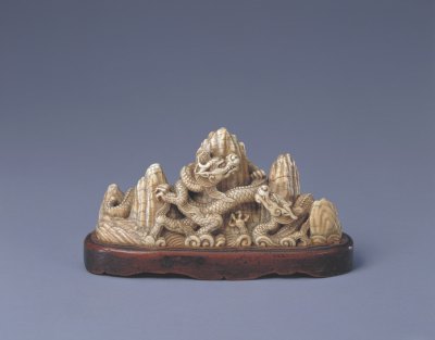 文人书案上的笔架与瓶、盒等,造型和纹饰一般以松、竹、梅居多,有龙纹者则多属皇家御用品。此件龙纹笔架既见刀刻之功,又具雄劲风韵。雕龙蜿蜒盘曲,生动的龙身及龙须、龙嘴均显现出典型的明代风格。整座笔架雕刻得庄重浑朴,刚劲有力,属明代嘉靖、隆庆年间(1522-1572年)北派象牙雕刻艺术中的杰作。