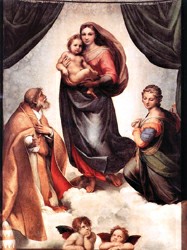 图:拉斐尔的圣母像是其艺术生涯的丰碑。《西斯廷圣母》是他一生共创作百余幅圣母像中最成功的一幅。画面采用稳定的金字塔形构图,人物和真人大小相仿,背景用小天使的头像组成,构思新颖独到。