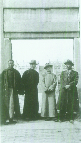 1935年,朱启钤(右一)、梁思成(右二)和刘敦桢(右三)考察北京天坛修缮工程。