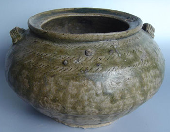 原始瓷器。敛口,沿外侈,束颈,溜肩,鼓腹,腹以下收敛,矮圈足。胎质灰、硬,肩部两侧各有一横系对称分布,上饰横条纹,肩腹部饰三组斜线纹。釉青黄色。