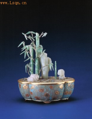 盆木胎,略呈椭圆形,四出海棠式,凸沿,敛腹,四如意足。口沿髹金漆,盆外部于淡蓝色地上以金漆描绘冰梅纹,花朵用红色勾边,色彩鲜明悦目。盆内以碎料块为盆土,点缀点蓝金属叶片,上立翠竹三竿,绿色明快,质地纯净,用金属丝缠裹绿色丝线弯折而成的枝条嵌于竹竿中,顶端系翠叶子,错落有致。竹竿旁放置青玉湖石三具,并翠竹笋一只。竹竿相拥而立,湖石、竹笋距离稍远,繁简高低相映成趣。