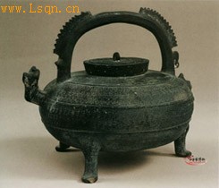 高17厘米、口径4.1厘米。 原始瓷器,小口低领,口上盖有平顶直壁带钮盖;广肩,扁圆腹,圜底,三兽蹄形足;肩的前部有龙首流,相应肩的后部有小尾,流与尾间有一象征龙体的拱形提梁-梁脊上又饰有三段脊棱,器表满涂青绿色釉。系江浙地区东周时期盛行的提梁壶形器。
