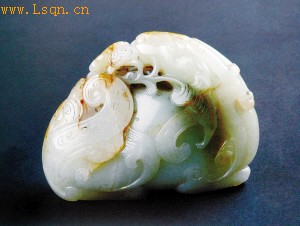 河北省民俗博物馆收藏着一件清代玉器佳作——镇纸,该器由一块带黄色玉皮的白玉制作而成,长9.3厘米,宽3.9厘米,高6.9厘米。该作品自然随形,因材施艺,造型规整,整体用浮雕技法刻画了一只跪卧回首的瑞兽,其双角贴于脑后,双眼圆睁,口衔灵芝,尾部夸张盘绕,蹄足分明,器身以阴线做装饰,琢磨精细,光泽温润,既可以把玩又可作为镇纸使用,实为一件不可多得的艺术珍品,极具收藏价值。