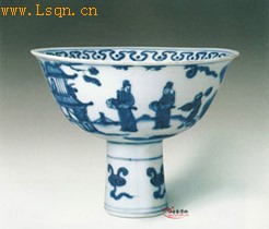 高10.5厘米、口径15.2厘米、足径4.5匣米。 碗敞口微撇,圆腹,高圈足中空。里外以青花为饰。碗心绘山石人物,里口沿绘变形云头纹一周,外壁主题图案绘携琴访友图,高足上绘灵芝纹四朵。 采用携琴访友作为青花瓷器的装饰,是嘉靖青花民窑中的常见题材,描绘了文人士大夫悠然自得的闲情逸趣。具有极高的欣赏价值。