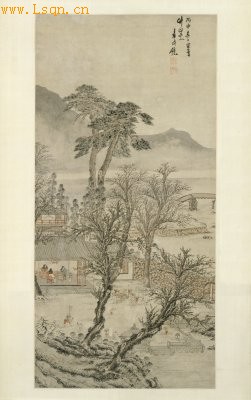 袁尚统绘,纸本,设色,纵107.8cm,横52.2cm。 本幅款识:“丙申春日客于竹深处。袁尚统。”钤“尚统私印”(白文)、“袁氏叔明”(白文)印二方。 岁朝,是指一岁之始,此时一元复始,万象更新,历代画家作岁朝图含有元旦开笔、预祝一年万事吉利之意。图绘山村一隅,诸多孩童在院中敲锣、打鼓、放鞭炮,尽情嬉戏玩乐,屋内三位长者同桌对饮,观看儿童嬉耍。树石勾勒填色后皴擦,远山以花青淡淡涂染,笔法稳健苍老,画风质朴古拙。丙申为清顺治十三年(1656年),袁尚统时年87岁。
