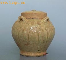 高13.5厘米,底径8厘米。 小唇口、丰肩、斜削腹、平底。通体施青釉,釉层泛黄肥厚并带有细密纹片。肩部有四系,系下为直线排列之圆形,代表莲子,腹部饰有大片仰莲纹,代表盛开的莲花,为典型南北朝时期作品,小件大器,美感十足。带有原盖,非常难得。