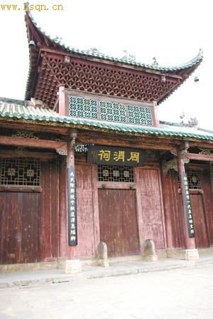 周渭祠是祭祀北宋监察御史周渭的祠庙。周渭祠门楼,是全庙的精华所在。门楼面阔五间,重檐歇山,五层斗拱逐层出挑,屋顶飞檐高翘,显得雄伟壮观。由座斗、交手斗、鸳鸯交手斗三种形式组合成的严谨而有规律的重檐,形似蜂窝,人们称之为“蜜蜂楼”。斗拱单体形似鸡爪,使上层重檐气流畅通并产生回流,不时发出轰鸣之声,令雀鸟们不敢在此筑巢造窝,起到了自然保护免遭虫鸟侵害的作用,为今人研究中华古建筑提供了宝贵的实物例证。