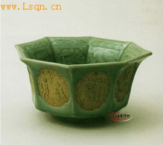 元 龙泉窑青釉露胎开光印花八角碗