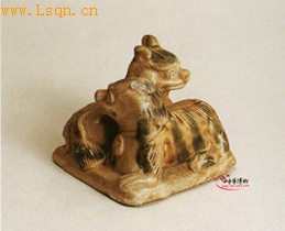 高6厘米。 双狮对向蹲伏于方形托板之上。竖耳、双目圆睁,颈下垂系饰物,头稍右转,平视前方。胎质灰白,器身点缀褐绿彩斑,外施青釉。 该狮造型虽显僵硬呆板,但是温驯服贴的幼狮形象仍逗人喜爱。褐绿彩釉装饰更增添了幼狮的活力。 此器应是一种文房器具--镇纸。书写时可用于压纸。