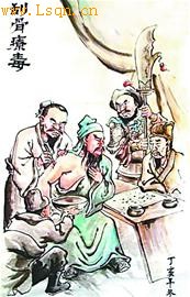 《三国演义》第七十五回有这样的叙述,“佗曰:‘此乃弩箭所伤,其中有乌头之药,直透入骨;若不早治,此臂无用矣。’”此后就上演了华佗给关公刮骨疗毒的千古绝唱。陈寿的《三国志》里面也提到刮骨疗毒,只不过动手的是关羽军中的医生。