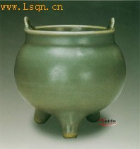 高12.5厘米、口径10.3厘米。 直口乎唇,唇面对称地装半圆形双耳,短颈,腹近圆形,下承三乳足外撇,与足相连的内底镂小孔。胎灰白,口颈外壁施青色厚釉,内壁施薄釉,呈青白色,足底无釉呈火石红色。