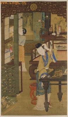 图中精致的家具、富丽的陈设所构筑出的典雅高贵的环境,表明此图表现的是宫廷女子日常生活的景象。梳妆打扮是贵族妇女每日生活中的重要内容之一,对此,她们不敢有丝毫的怠慢。图绘晨起的女子对镜理妆的情景。她为了取得良好的照镜角度,不禁起身而立,双目注视着桌上的铜镜,同时,左手缓缓地往云鬓上插玉簪。情节生动,人物举止自然,显示出作者细致入微的观察力和准确传神的艺术表现力。