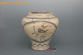 明 扒村窑白地黑花三开光花鸟纹鸡腿瓶