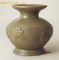 青瓷唾壶,喇叭口,矮束颈,扁圆腹,腹下内收,圈足外撇,肩腹际饰两周刻划弦纹,腹部排列六处模印堆贴纹饰,一为仙人骑神默,一为祥云朱雀,两者间隔而置,两两相对,装饰效果颇类浮雕。除器底外,通体施青黄釉。