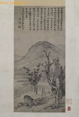 明万历七年(1579年),宋旭绘,纸本,墨笔,纵66.8cm,横32cm。 本幅有长题,落款“万历己卯十月廿檇李宋旭”,钤“初阳”朱文、“檇李宋旭”白、朱文、“石门山人”白文印。“己卯”为明万历七年(1579年),宋旭时年55岁。 此轴绘篱墙茅屋,修竹嘉木,陂陀巨石,二雅士对坐攀谈。画风清朗,构图简练,笔墨苍润,意境高远。题记中流露出对昔日在孙克弘的雪居园中结社赋诗的怀旧之情,亦表明此图是为旧友冯万峰而作。画面描绘的应该是画家与冯氏谈诗论道之景。